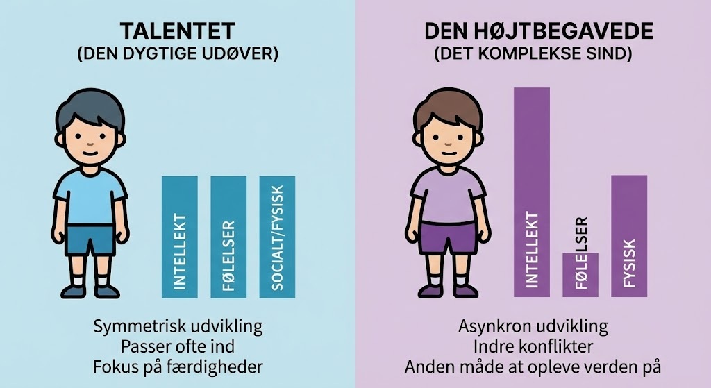 | Udvikling | Ofte lineær udvikling gennem øvelse og træning. | Asynkron udvikling. Intellektuelt foran, men måske følelsesmæssigt/socialt alderssvarende. |