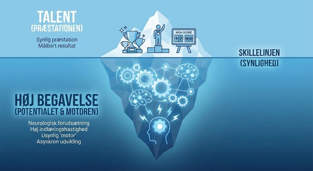 - Talent: Systematisk udviklede færdigheder og dokumenteret høj præstation i et specifikt domæne (matematik, sprog, musik, idræt, programmering m.fl.). Tænk “præstation” som resultatet af læring, træning, feedback og muligheder [1; 2].